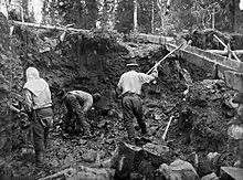 Since the government fees and taxes were extremely high, only the 19 wealthiest prospectors were able to make claims and then employ the rest of the prospectors. The largest claims had 30–40 men, who worked for 11 hours per day, six days a week.[3] The major claims produced some 10 kilograms of gold yearly, but the rush was over soon, as the gold started running out. In 1873, the government fees were cut in half and a year later a special law for the gold prospecting on the Tana River was passed.[4] The Ivalo River area was almost abandoned in the early 1880s, and the few prospectors that were left moved to Sotajoki and to the Laanila village, located 10 kilometers east. In 1883–1884, the Kultala Crown Station was used by the professor Selim Lemström for exploring the northern lights, until it was closed in 1900. During the 1920s, two companies were practicing industrial gold mining, but both went bankrupt within a few years.[5]