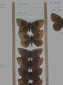 E. scipio Bsd. (37b). Rather large, the wings narrow and elongate, the distal margin but little curved. The russet-red band of the forewing is interrupted by the veins, being costally rather broad and narrowing posteriorly. There are anteriorly 2 equal-sized white-centred ocelli standing close together and being followed by 2 additional small black ocelli wliich have likewise white pupils. On the underside these last two are frequently absent or are represented by simple black dots. The band of the hindwing consists of 3 -4 elongate russet-red spots, which have but rarely small ocelli. On the underside the forewing is russet-red in the male, and russet -yellow in the female, the costal and distal margins being grey- brown in the male and white-grey in the female. The ocelli as above. The hindwing beneath is dark brown in the male, sometimes somewhat paler towards the outer margin, being uniformly white-grey without any markings in the female. In the Basses Alpes, for instance at Digne in South France.[2]