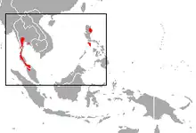 It was first documented in Thailand in 1972.[2] In 1992, it was additionally documented in the Philippines.[3] It is also found in Peninsular Malaysia. It has been documented at a range of elevations from 50–400 m (160–1,310 ft).[1]