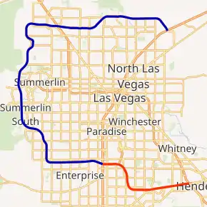 The Las Vegas Beltway (officially named the Bruce Woodbury Beltway) is a 50-mile (80 km) beltway route circling three-quarters of the Las Vegas Valley in southern Nevada. The Las Vegas Beltway carries two numerical designations. Approximately 12.8 miles (20.6 km) of the highway, from its southern terminus at Interstate 11 (I-11) / I-515 / U.S. Route 93 (US 93) / US 95 in Henderson west and northwest to I-15, is signed as Interstate 215 (I-215) and maintained by the Nevada Department of Transportation.[2] Clark County Route 215 (CC 215) composes the remaining 37.2 miles (59.9 km) of this semi-circumferential highway, with the county's Department of Public Works responsible for all construction and maintenance.
