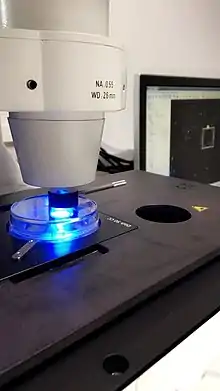 Another closely related LCM process (used by Leica) cuts the sample from above and the sample drops via gravity (gravity-assisted microdissection) into a capture device below the sample.[8] The different point with upper one is, the laser beam here is moving to cut tissue by moving dichroic mirror.