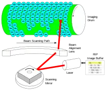 Some non-laser printers (LED printers) use an array of light-emitting diodes spanning the width of the page to generate an image, rather than using a laser. "Exposing" is also known as "writing" in some documentation.