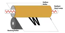 The paper passes through rollers in the fuser assembly, where temperatures up to 427 °C (801 °F) and pressure are used to permanently bond the toner to the paper. One roller is usually a hollow tube (heat roller) and the other is a rubber-backed roller (pressure roller). A radiant heat lamp is suspended in the center of the hollow tube, and its infrared energy uniformly heats the roller from the inside. For proper bonding of the toner, the fuser roller must be uniformly hot.