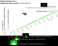 The graphic (right) illustrates laser safety concepts.[13] For example, it shows that the areas of most concern—eye damage, flash blindness and glare—occur relatively close to the aircraft. The distraction risk covers the longest hazard distance, but also presents the least concern. The photos in the graphic also give an idea of what the visual effect looks like to the pilot, at various distances. While the distances given are exact, the laser's brightness is in fact falling off slowly and so effects diminish continuously with increasing distance.