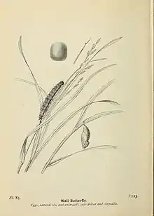 "The egg is pale green when first laid, and in shape it is almost spherical, but rather higher than broad; it is finely ribbed and reticulated, but unless examined through a lens it appears to be quite smooth. The caterpillar when full grown is whitish-green, dotted with white. From the larger of these dots on the back arise greyish bristles; the three lines on the back (dorsal and sub-dorsal) are whitish, edged with dark green; the line on the sides (spiracular) is white, fringed with greyish hairs; anal points green, hairy, extreme tips white. Head larger than the first ring (first thoracic segment), green dotted with white and hairy, jaws marked with brownish. The chrysalis is green, with yellow-tinted white markings on the edge of the wing covers and ridges; the spots on the body are yellowish, or sometimes white. Occasionally the chrysalids are blackish, with white or yellow points on the body". (South 1906)