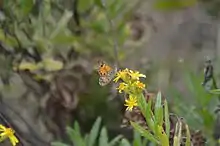 Lasiommata paramegaera, the pale wall brown or Corsican wall brown,[1] is a butterfly species belonging to the family Nymphalidae. It is endemic to Corsica and Sardinia.[2] The wingspan is 36–40 mm. The upper and undersides of the fore and hind wings are orange brown, they have a dark brown grid-like pattern. The females are often a little lighter colored. Near the apex of the forewing sits a white centred black eye-spot. Between this eye-spot and the outermost apical tip of the fore-wing is another very small black round spot. In the disc region of the top of the forewing, the male has a distinct scent-mark . The upperside of the hind wings has cells 1c, 2, 3, and 4 of the postdiscal region with small black, white-pupilled eye spots on. The underside of the forewings is orange-brown, the underside of the hind wings light brown. On the front wing, the underside pattern corresponds to the upperside. However, the eye spot in the apex is also surrounded by a brown ring.