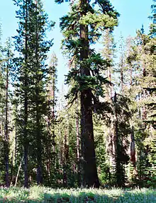 Surveys estimate the forest contains 92,000 acres (37,000 hectares) of old growth. Sierra Nevada mixed conifer forests (Coast Douglas-fir (Pseudotsuga menziesii var. menziesii), Ponderosa Pine (Pinus ponderosa), and White Fir (Abies concolor)), Jeffrey Pine (Pinus jeffreyi) forests, Red Fir (Abies magnifica) forests, and Lodgepole Pine (Pinus contorta) forests are the most common types.[7] It is a major source of lumber products.