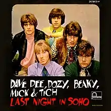 "Last Night in Soho" is a single by English pop band Dave Dee, Dozy, Beaky, Mick & Tich, released by Fontana on 28 June 1968. Written by the band's regular songwriters Ken Howard and Alan Blaikley, it was the follow-up to the chart topper "The Legend of Xanadu" and gave the band their final top-ten placing on the UK Singles Chart, reaching number 8.[3]