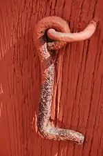 A cabin hook is a hooked bar that engages into a staple.[9][10] The bar is usually attached permanently to a ring or staple that is fixed with screws or nails to woodwork or a wall at the same level as the eye screw. The eye screw is usually screwed into the adjacent wall or onto the door itself. Used to hold a cupboard, door or gate open or shut.[11]