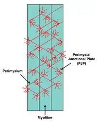 The collagen fibers in the perimysium usually orient between 45 and 60 degrees to the long axis of the muscle fibers in their relaxed state.[1] Well defined contact regions between the endomysium and perimysium were observed and coined the perimysial junctional plate (PJP).[14] These sites were hypothesized to be a focal region for delivery of tension during muscle contraction. To test the possibility of tensile force transmission via the perimysium, it was experimentally shown that cutting of the aponeurosis in a pennate muscle did not prevent tension generation further along towards the tendon.[6] Also, in a separate study it was clearly demonstrated that the perimysium could transmit force if tendons normally transmitting force from distinct parts of the extensor digitorum longus muscle were cut.[5]