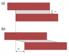 Any linkage transmitting force from the muscle fibers to the tendon must be non-compliant (i.e. high stiffness) in order to be efficient. Experimental force-length measurements showed that the passive tensile properties of relaxed muscle were mainly from the elastic resistance of the myofibrils and not the connective tissue.[9] Also, analysis of the non-linear tensile properties of the endomysium showed that under normal physiological conditions the collagen networks were too compliant in tension to act as efficient force transmitters in tension.[4] Therefore, the concept of shear linkage between adjacent muscle fibers in the endomysium was introduced.[10] The figure to the right is a model consisting of two parallel muscle cells with the endomysium sandwiched between them. Assuming the simplest linear models, the shear stress (F/LW) and the shear strain (ΔL/H) in the endomysium can be related to the shear modulus (G) by the following equation: