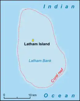 Latham Island is a flat coral island located 60 km (37 mi) south-east of Unguja and 66 km (41 mi) east of Dar es Salaam. It is roughly 300 metres (980 ft) long and 300 metres (980 ft) wide, and has an area of 3 hectares (7.4 acres). The island is surrounded by a fringing reef and is oceanic, as it lies off the continental shelf and is surrounded by deep water.[2][3]