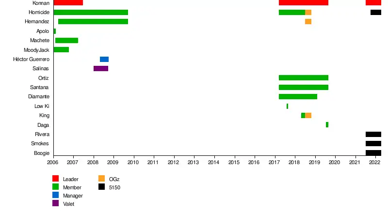 In 2017, LAX returned to Impact Wrestling, with founding members Konnan and Homicide being joined by Diamante, Santana and Ortiz. They were briefly joined by Low Ki, and King who later assumed leadership when Konnan was absent. King later split the group along with Hernandez and Homicide to form The OGz. When Santana and Ortiz left for All Elite Wrestling (AEW), the stable became dormant. The latest rendition is called LAX 5150 or simply 5150 and is composed by Slice Boogie, Danny Rivera and Julius Smokes. It began working for MLW in July 2021, once again managed by Konnan.