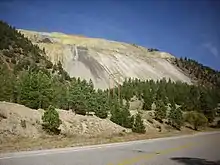 The underground Molycorp molybdenum mine exploited molybdenum mineralization under Goat Hill, which dominates the mouth of the Red River Canyon as seen from the town of Questa. The ore was emplaced by hot meteoric water circulating through fracture zones above the cooling plutons on the south margin of the Questa caldera, with the best deposits found where the Sulfur Gulch pluton meets precaldera andesite. The mineral zone is dominated by pyrite, alkali feldspar, fluorite, calcite, and quartz,[3] with the chief molybdenum ore being molybdenite.[11]