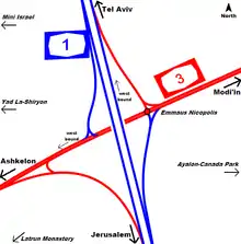 Latrun Interchange is a key road interchange of Israel, located in the Latrun Salient in the Israeli occupied West Bank. It lies on the route between Jerusalem and Tel Aviv, at the intersection of Highway 1 and Highway 3.