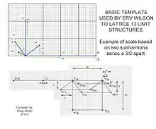 In musical tuning, a lattice "is a way of modeling the tuning relationships of a just intonation system. It is an array of points in a periodic multidimensional pattern. Each point on the lattice corresponds to a ratio (i.e., a pitch, or an interval with respect to some other point on the lattice). The lattice can be two-, three-, or n-dimensional, with each dimension corresponding to a different prime-number partial [pitch class]."[1] When listed in a spreadsheet a lattice may be referred to as a tuning table.