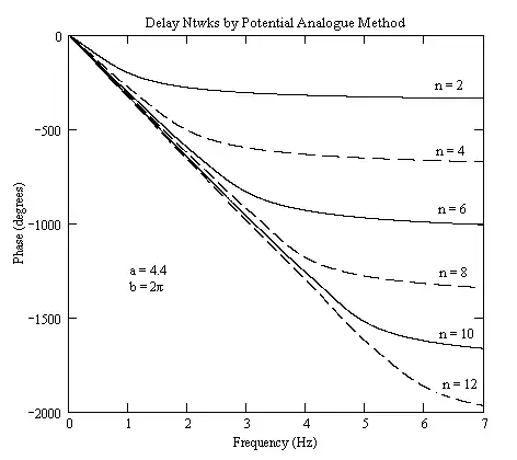 A good approximation to a unit delay characteristic is obtained by putting a = b = 2π (a value which is easily remembered). However, the delay ripple (granularity) that results, when using these values of a and b, is rather high at ±8% and a better choice for a is 4.4 (= 1.4π) which gives a ripple a lower ripple of ±2.5%. The plots shown below, are for networks with increasing numbers of poles and zeros, for a = 4.4 and b = 2π. The order ‘n’ corresponds to the number of pole-zero pairs present in the network.
