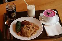Latvia is much richer in milk products than other Western countries. Cottage cheese (biezpiens), sour cream (skābais krējums), soured milk (rūgušpiens) and a different types of fresh and dried cheeses are available. Kefir, soured milk and other fermented milk beverages are usually consumed with hot dishes.[3]