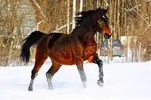The Latvian Horse (Latvian: Latvijas šķirne or Latvijas zirgi) is a purpose-bred warmblood horse breed from Latvia. Breeding began in Latvia in the early twentieth century,[2]: 316 and a herd book was established in 1927.[4] The breed was officially recognised in 1952. There are two types, sometimes called the Latvian Harness Horse[3] and the Latvian Riding Horse.[6]: 276 The harness type was predominant until about 1960, when demand for sport horses increased and more of the saddle type were bred.[2]: 316