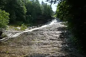 Laughing Whitefish Falls is formed by an abrupt limestone escarpment of the Laughing Whitefish River, which flows northward into Lake Superior. The escarpment is shaped so as to draw out the cascade into an unusual fan-shaped wall of water. The falls is located within the Escanaba River State Forest, three-quarters of a mile east of County Route 327 (North Sundell Road). It can be reached by a half-mile hike through beech-maple forest.[5] Foot trails also connect the falls to the North Country Trail, which runs through the north end of the park.[4]