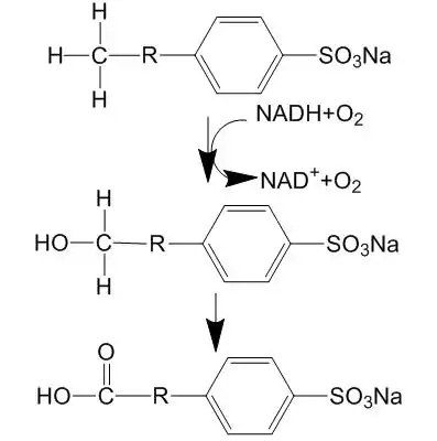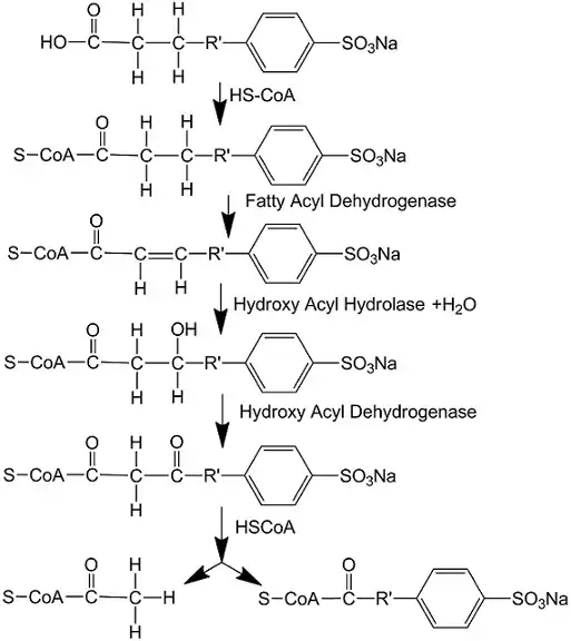 A complete biodegradation under aerobic conditions consists of two steps, primary biodegradation and ultimate biodegradation. The first step begins from the terminal carbon in the alkyl chain as omega-oxidation, which can start from one or both ends, then is followed by beta-oxidation. After the first step the residual is sulfophenyl(di)carboxylates (SP(d)Cs), a large molecule which can be involved in the second step. The second step occurs only when the required bacteria exist. The ring cleavage of benzene and the further desulphonation of the mono- and dicarboxylic sulphophenyl acids happen. After the two-step biodegradation, LAS is degraded into carbon dioxide, water, inorganic salts and residual biomass. During the biodegradation, several specific bacteria and oxygen are required in both omega-oxidation of the alkyl chain and the benzene ring cleaving process, so this biodegradation can only happen in aerobic conditions.[5] In anaerobic conditions in treatment process, LAS shows no change. Researchers also prove that biodegradation process is restricted in 20–40 mg/L and even inhibited at a higher concentration, which leads to the incomplete biodegradation of LAS in sewage treatment plants.[6]