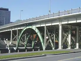 The Laurier Avenue Bridge is a bridge in Ottawa, Ontario, Canada. It carries Laurier Avenue over the Rideau Canal and also Colonel By Drive and Queen Elizabeth Driveway. The green steel arches makes the bridge one of the most recognizable in Ottawa. Many of the events of Winterlude are held around the bridge, and it is a common background to pictures of skaters on the canal. The southern entrance to the Department of National Defence Headquarters is located on the eastern portion of the bridge.
