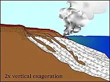 Collapse of the frontal part of lava deltas is common during their formation, representing a hazard for any people that are watching from a solidified part of the delta and such areas are normally marked as dangerous.[8] If a newly formed lava bench rests on sediments, it may pose hazards due to its extremely unstable structure.[6] Oftentimes, these benches are so unstable that they collapse into the sea, exposing the water to the hot lava on the interior of the bench and releasing acres of land into the ocean.[6] When the hot lava hits the water, violent explosions of steam can shoot large rocks and molten lava up to 300 feet (90 m) inland.[5] These collapses are extremely dangerous because they can happen without warning, and anyone or anything on the bench will be caught in the collapse. For safety, people are advised not to walk on lava benches because of their unstable nature, and they must maintain a safe distance from the lava bench.[9]