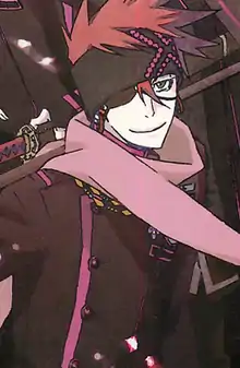 Lavi was designed to stand out within the other exorcists, resulting in him getting multiple accessories like a bandanna and a scarf.[2] Hoshino designed him with "droopy eyes" and a cheerful disposition. Hoshino made to be a Lavi a pretty boy. His facial expressures were based on a real person Hoshino knew which was a scrapped idea planned for a minor character. She found Lavi easy to illustrate, specifically his drooping eyes which she regards as the most important part of his design. Designwise, Lavi was made to be the opposite of fellow character Yu Kanda but still felt the scarf might give her issues during drawings.[3] However, she found it difficult to draw his smile due to his dark fate. Hoshino plans to write the truth behind Lavi's wish to become a Bookman and the reason why he wears an eyepatch. Lavi was going to have a bigger role in Alma Karma's story arc, but the large number of characters made this difficult.[4] Hoshino was surprised by Lavi's popularity as he made it to the top ten from the last character poll despite his lack of appearances in later story arcs.[5]