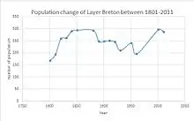 The population of Layer Breton over the past two centuries has seen gradual changes. For the first century the population fluctuated between 168 and 247. During 1801 the population was 168, the lowest the population has ever been to date. From this date up until 1881 the population continued to increase the population reached 293 however this would be the highest the population would reach until the 20th century, after this the population began to decrease falling to 247 in 1891 and staying around this number for the next 30 years with small fluctuation in the size of the population ( the population was 248 in 1901, 250 in 1911 and 244 in 1921).The population decreased in 1931 to 209 but the following census (1951) it had increased to 240 but this wasn't to last as the population dropped to 195 in 1961.[7] In 2001 the population of Layer Breton was 296 with 152 males and 144 females. According to the 2011 census there were 144 males and 143 meaning the population was 287 showing little change in the past 10 years.[8]