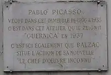 In 1927, Ambroise Vollard asked Picasso to illustrate Le Chef-d’œuvre inconnu. Picasso was fascinated by the text and identified with Frenhofer so much that he moved to the rue des Grands-Augustins in Paris where Balzac located Porbus' studio. There he painted his own masterpiece, Guernica. Picasso lived here during World War II.[5][6]