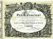 Le Petit Journal was a conservative daily Parisian newspaper founded by Moïse Polydore Millaud; published from 1863 to 1944. Together with Le Petit Parisien, Le Matin, and Le Journal, it was one of the four major French dailies. In 1890, during the Boulangiste crisis, its circulation first reached one million copies. Five years later, it had a circulation of two million copies, making it the world's largest newspaper.[1]