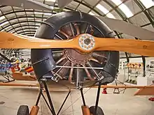 Although not powerful (the largest wartime version produced 130 horsepower (97 kW)), they were dependable rotary engines.[1] The Le Rhône 9 was a development of the Le Rhône 7, a seven-cylinder design. Examples of nine-cylinder Le Rhône rotary engines are on public display in aviation museums with several remaining airworthy, powering vintage aircraft types.