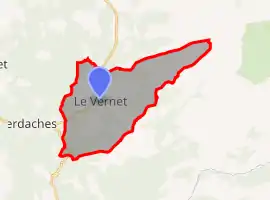The village of Le Vernet is located in the Bès Valley at 1,200 metres (3,900 ft) altitude.[4] Its population does not exceed 100 permanent residents, but it is often more than doubled each summer and winter, when the municipality becomes the place of departure for sightseeing excursions, particularly in the Blanche Valley, and a place of departure for the nearby ski stations (Grand-Puy, Saint-Jean-Montclar and Chabanon).