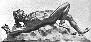 But the most apparent departure from L'ange du mal is the placing of Lucifer in bondage, with his right ankle and left wrist chained. In 19th-century reinterpretations of ancient Greek and Christian myths, Lucifer was often cast as a Promethean figure, drawing on a tradition that the fallen angel was chained in Hell just as the Titan had been chained and tortured on the rock by Zeus: "The same Prometheus who is taken as an analogue of the crucified Christ is regarded also as a type of Lucifer," wrote Harold Bloom in remarks on Mary Shelley's 19th-century classic Frankenstein, subtitled The Modern Prometheus.[32] In A.H. Krappe's folkloric typology, Lucifer conforms to a type that includes Prometheus and the Germanic Loki.[33]