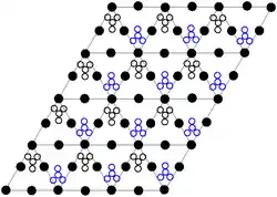 The black dots represent the lead atoms, the white dots the nitrate groups 27 picometres above the plane of the lead atoms, and the blue dots the nitrate groups the same distance below this plane. In this configuration, every lead atom is bonded to twelve oxygen atoms (bond length: 281 pm). All N–O bond lengths are identical, at 127 picometres.[15]