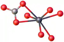 Like all metal carbonates, lead(II) carbonate adopts a dense, highly crosslinked structure consisting of intact CO32- and metal cation sites. As verified by X-ray crystallography, the Pb(II) centers are seven-coordinate, being surrounded by multiple carbonate ligands. The carbonate centers are bonded to bidentate to a single Pb and bridge to five other Pb sites.[4]