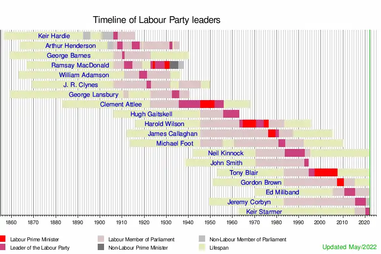 The post of Leader of the Labour Party was officially created in 1922. Before this, between when Labour MPs were first elected in 1906 and the general election in 1922, when substantial gains were made, the post was known as Chairman of the Parliamentary Labour Party.[1] In 1970, the positions of leader of the Labour Party and chairman of the Parliamentary Labour Party were separated.