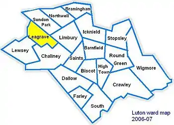 Leagrave is mostly within the Leagrave ward, although some parts are within the Limbury and Sundon Park wards. The Leagrave ward also includes Hockwell Ring and Tophill.
