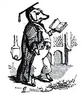 William Blake attacked debased public taste in a poem (c. 1808-11) dedicated to the artist James Barry, writing that the nation which neglected Barry might "give pensions to the Learned Pig / Or the Hare playing on a Tabor".[13] He also alludes to it in his 1784 satire An Island in the Moon.[14] In 1807 Robert Southey parodied the contrast between real genius and meretricious celebrity by referring to the pig, noting that "the learned pig was in his day a far greater object of admiration to the English nation than ever was Sir Isaac Newton."[13] William Wordsworth refers to the pig in The Prelude, describing it as one of the "freaks of nature" to be seen at Bartholomew Fair: