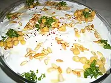 Cheese, as well as yogurt and eggs, are commonly used in Lebanon.[43] One of the more recognizable dishes within Lebanon is labneh. Unlike regular yogurt, labneh is strained so as to remove the watery whey, leaving a thicker, creamier consistency. It is spreadable and garnished with olive oil and sea salt.[44] It is an extremely versatile dish that can be served in a mezze platter for either breakfast or dinner. A variant is mixed with garlic.[44] Ejjeh is the traditional omelette of Lebanon.[45] It is made with egg, chopped parsley and scallions. Within Lebanon, people make this omelette with different herbs that are cultivated from their village.[46][47]