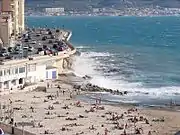 On the sea side of the Corniche Kennedy is a bench running nearly its entire 3 km (1.9 mi) length, with almost no interruption; this made people from Marseille dub it the "longest bench in the world".[1] Despite it being forbidden to jump into the sea from the Corniche, it is a popular activity for local residents.