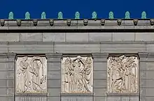 - Marble reliefs above the windows of the Deborah Cook Sayles Public Library, Pawtucket, Rhode Island, 1902 (Cram, Goodhue & Ferguson)[7][8]
