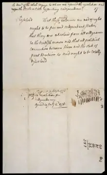 Congress as a whole was not yet ready to declare independence at that moment, because the delegates from some of the colonies, including Maryland, Pennsylvania, Delaware, New Jersey, and New York, had not yet been authorized to vote for independence.[5] Voting on the first clause of Lee's resolution was therefore postponed for three weeks while advocates of independence worked to build support in the colonial governments for the resolution.[6] Meanwhile, a Committee of Five was appointed to prepare a formal declaration so that it would be ready when independence, which almost everyone recognized was now inevitable, was approved. The committee prepared a declaration of independence, written primarily by Thomas Jefferson, and presented it to Congress on June 28, 1776.