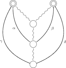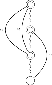 In the following figures, simple circle nodes represent vertices, double circle nodes represent subtrees, twisted segments represent tree paths, and curved arcs represent cotree edges. The root of each tree is shown at the bottom of the figure. In the first figure, the edges labeled and are T-alike, meaning that, at the endpoints nearest the root of the tree, they will both be on the same side of the tree in every planar drawing. In the next two figures, the edges with the same labels are T-opposite, meaning that they will be on different sides of the tree in every planar drawing.