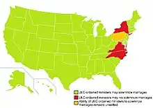 In the United States, the requirements for entering into marriage are determined by state law. In most states, the ULC clearly falls under the statutes setting forth the requirements for ordination of ministers to perform marriages. In a small number of states,[13] this issue has been litigated, with determinations made by courts at various levels. In Mississippi, for example, it ultimately fell to the Mississippi Supreme Court to recognize the power of a minister of the Universal Life Church to solemnize marriages.[22] although some states allow anyone to solemnize a marriage.[23] Courts in New York, North Carolina, and Virginia have ruled that, under applicable state law, ULC ministers are not authorized to solemnize marriages and a marriage at which a ULC minister officiated therefore is not valid.[24] However other New York courts have allowed ULC ministers to perform marriages. Similarly, lower courts in Pennsylvania have split on the issue.[25]