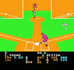 The player controls the pitcher from a viewpoint behind the batter, rather than from behind the pitcher, as in some baseball simulations. The player can throw three different pitches. The pitching coach interjects if the player underperforms; this feature is absent from most baseball simulations of the 1980s and 1990s.
