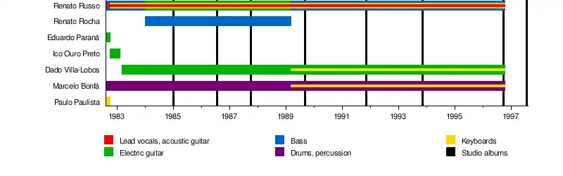 - Renato Russo – bass guitar (1982–1984, 1989–1996), electric guitar (1984–1989), lead vocals, acoustic guitar, keyboards (1982–1996; died 1996)