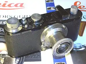 The Leica Standard was introduced as a basic model by Ernst Leitz, Wetzlar in October 1932. The camera began production in the same year as the Leica II with a coupled rangefinder. The Leica III with lower shutter speeds was introduced in 1933; this model would later have the faster speed of 1/1000 sec with the IIIa of 1935, though the Leica III would continue in parallel production for several years. All these models use the standardised lens mount with distance from film plane to lens flange fixed to 28.8 mm, a Leitz standard. This feature was first seen on late Leica I model C cameras in 1931, and all Leica II, Model D from 1932, identified by a "0" (zero) stamped on the lens mount flange at the top, to indicate the implementation of the standard, a practice that was continued for some time. It is found on early Leica Standards as well. On the back of these models there is a hole covered by a black plug, presumably for back focus calibration. The original lens for the Leica Standard when introduced was the Leitz Elmar 1:3.5 F=50mm in a collapsible nickel-plated focusing mount with infinity catch.[1]