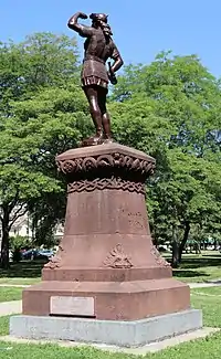 The original statue resides in Boston, Massachusetts on Commonwealth Avenue. In November 1887, the Milwaukee replica was erected; however, at the request of its donor, Mrs. Joseph Gilbert, there was no dedication ceremony.[2] On 26 April 2003, the Sons of Norway Fosselyngen Lodge held a ceremony to celebrate the recent addition of the statue's lighting, which cost $3,800. The funds were bequested by the late lodge member, Duane Olson. The addition was a joint effort between the Sons of Norway Fosselyngen Lodge, Milwaukee County and the city of Milwaukee.[3] Prior to this, there had been evidence of structural instability, through cracks, erosion, and the deterioration of caulking in a pedestal.[1]