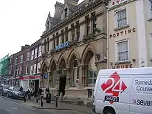 Leighton Buzzard developed into a thriving market town supported by good road, canal and, later, rail links to the agricultural hinterland and London. The town's market charter was granted in 1086 and is still active today.[5] The town's high street is home to numerous historical buildings, more than 70 of which are listed.[6] They include the notable Bank Building on the Market Square (now home to Barclays Bank),[7] designed by the eminent architect Alfred Waterhouse, designer of London's Natural History Museum, London. They also include the Old Town Hall, later used as a fire station and now as a restaurant.[8]